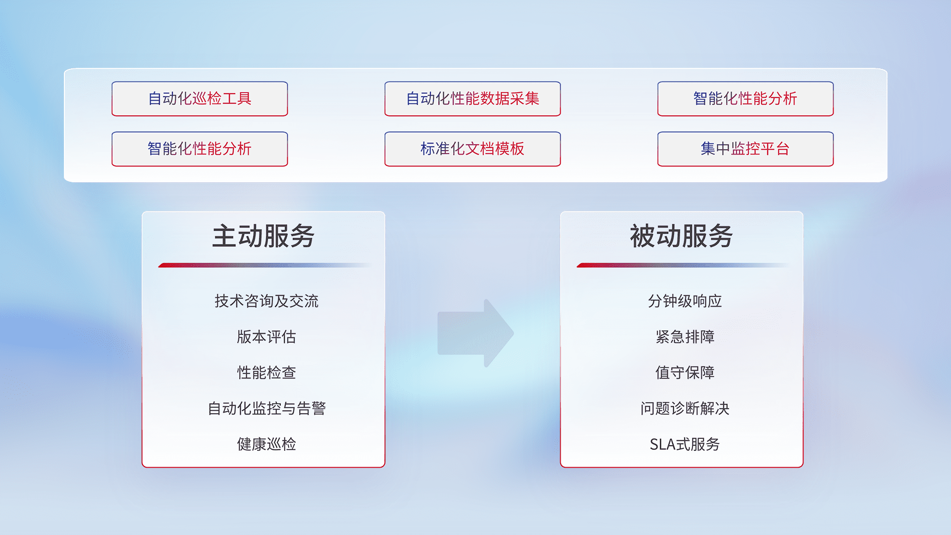 智能化工具和标准化文档,,,保障服务质量,,,,提供主动服务(包含技术咨询、、、版本评估、、、性能检查、、、自动化监控与告警、、、、健康巡检)和被动服务包含(分钟级响应、、、紧急排障、、、值守保障、、、问题诊断解决、、、SLA服务)。。