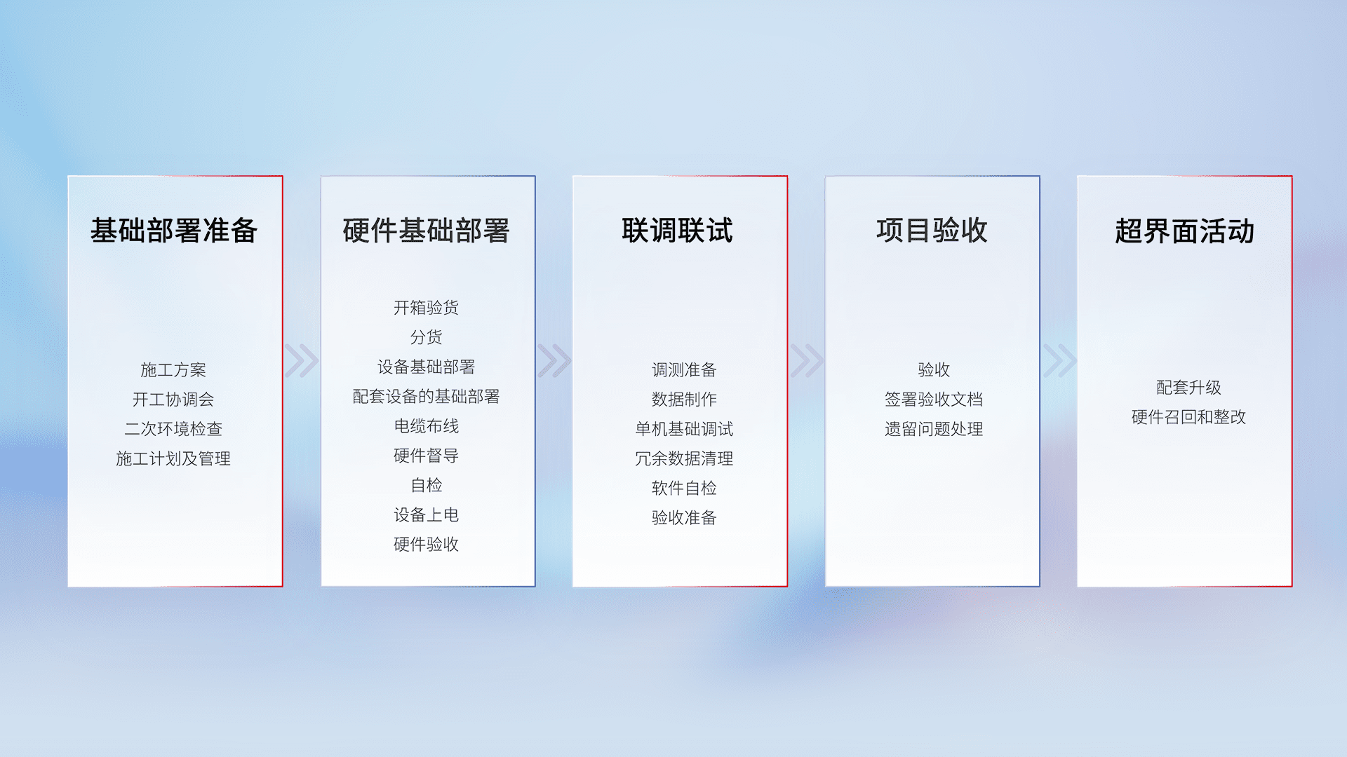 从基础部署准备、、硬件基础部署、、联调联试、、、项目验收、、、、越界面活动的全过程可追溯,,,,保证施工质量和进度。。